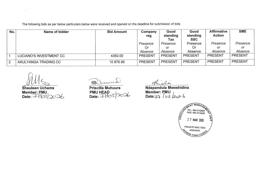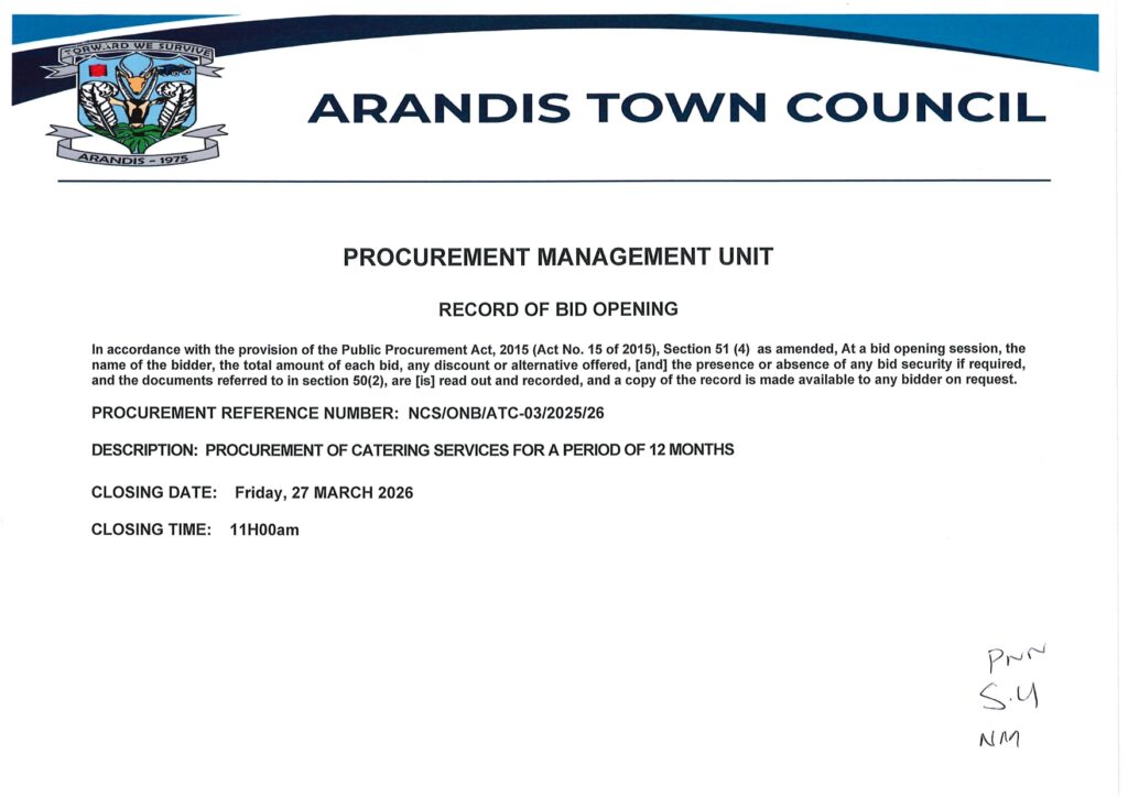 BID OPENING: PROVISION OF CATERING SERVICES FOR THE ARANDIS TOWN COUNCIL FOR A PERIOD 12 MONTH March 27, 2026 by Shauleen Uchams in Procurement, Procurement