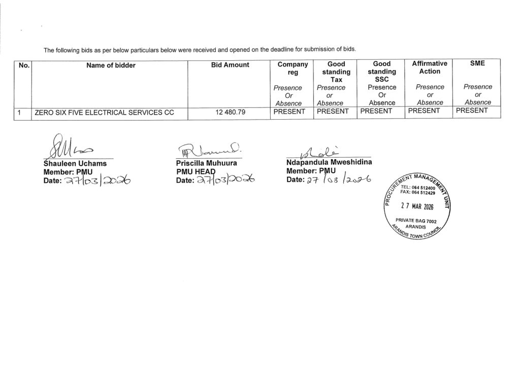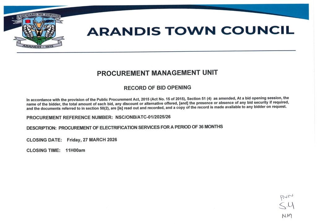 BID OPENING: PROVISION OF ELECTRIFICATION SERVICES FOR THE ARANDIS TOWN COUNCIL FOR A PERIOD 36 MONTHS March 27, 2026 by Shauleen Uchams in Procurement, Procurement