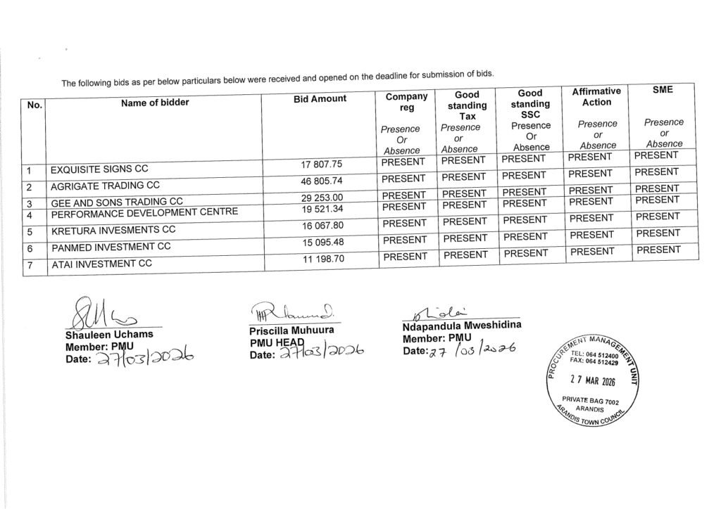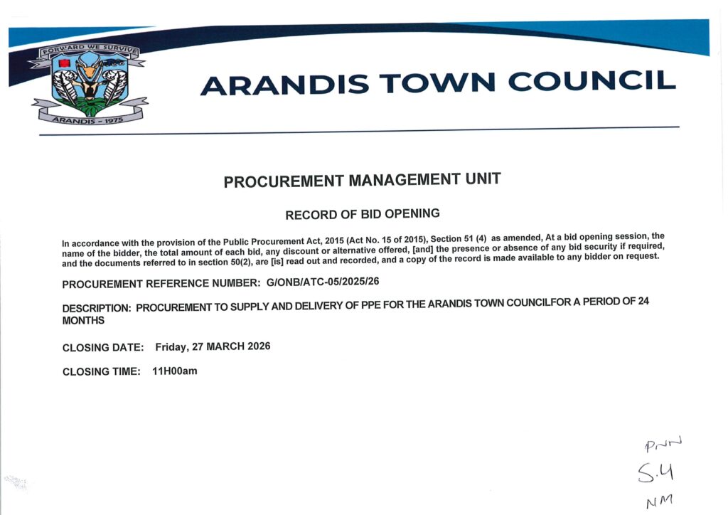 BID OPENING: SUPPLY AND DELIVERY OF PERSONAL PROTECTIVE EQUIPMENT TO THE ARANDIS TOWN COUNCIL FOR A PERIOD OF 24 MONTHS March 27, 2026 by Shauleen Uchams in Procurement, Procurement